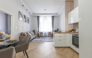 Tágas, világos amerikai konyhás nappali, amely a lakás központi élettere