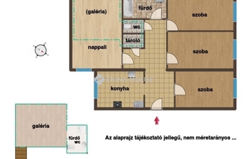 A lakásba a kapuszínből jutunk be, előszobájából nyílik a három utcafronti szoba, a fürdő-wc, a ház belső udvarára tájolt a konyha és a galériázott nappali, a galériából nyílik egy kisebb, zuhanyzós fürdő-wc. (összesen 80 m2 + a galériaszint). Az ingatlan 2010 és 2015 között teljes felújításon esett át, műszakilag is korszerűsítve lett, esztétikailag is hibátlan állapotban van. Fűtését gáz-cirkó kazán biztosítja, alternatívaként hűtő-fűtő klímaberendezést is felszereltek.
