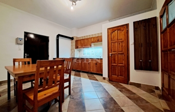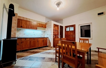 Fa konyhabútor, ebédlőasztal székekkel, vegyes tüzelésű kályha.