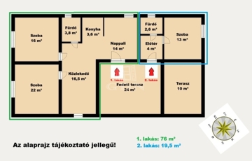 Az elrendezés PRAKTIKUS és RUGALMAS: az ingatlan két, egymástól elkülönülő egységre tagolódik. Egy külön, 19,6 m2-es ELSZEPARÁLT SZOBA saját FÜRDŐSZOBÁVAL rendelkezik, ennek fűtését INVERTERES KLÍMA adja. Emellett található egy 75,9 m2-es lakótér, amely 2 SZOBÁBÓL, NAPPALIBÓL, FÜRDŐSZOBÁBÓL, ELŐTÉR–ÉTKEZŐBŐL és KONYHÁBÓL áll. Ez a kialakítás sokféle használati módot támogat, és jól átlátható.