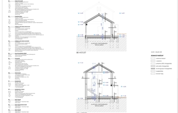 -Tető: Betoncserepes héjazat, korcolt lemezfedésű előtetőkkel