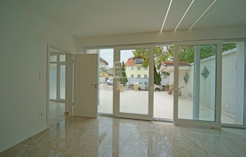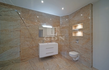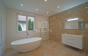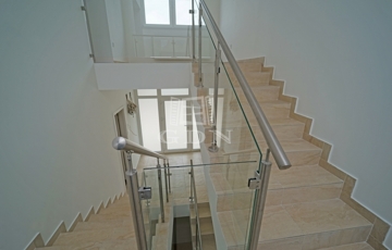 A minőség fontos szempont volt a kilakításnál, a földszinten a padlót 60x120-as márvány lapokkal burkolták, a lépcsőház korlátai rozsdamentes acél és üveg kombóval készültek, a három fürdőszoba szaniterei, bútorai és csaptelepei az Arezzo Design termékeiből lettek ízlésen kiválasztva.