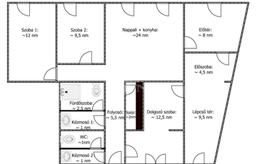 - Földszinten: előtér, mosdó+WC, fürdőszoba, folyosó, spájz, nappali-konyha-étkező, 2 szoba, dolgozó szoba, előszoba, lépcső tér.
