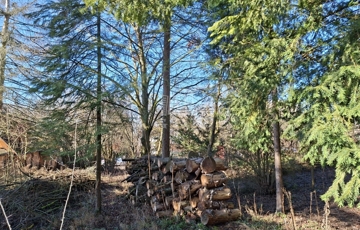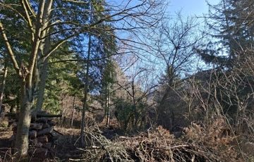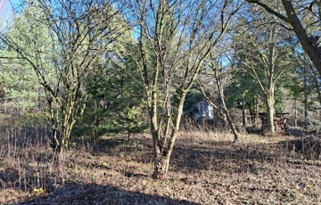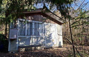 A telek zöld, a növényzet természetes, valamint van rajta egy barátságos kis ház, tárolóval.