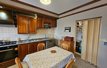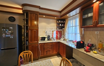 A konyha világos, elegáns kivitelű, praktikusan elrendezett, teljesen gépesített, az étkezővel átadó pulttal is össze van kötve. Az étkezőrész és a nappali tágas, a rajta található tolóajtón keresztül a nagy teraszra is ki lehet ülni.