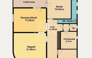 Helyiségek:Nappali+ kettő szoba, fürdőszoba, külön wc, tároló-kazánház, közlekedő- előszoba helyiségekből áll, valamint egy 12nm-es terasz ami a hálóból-valamint a konyha étkezőből egyaránt megközelíthető.