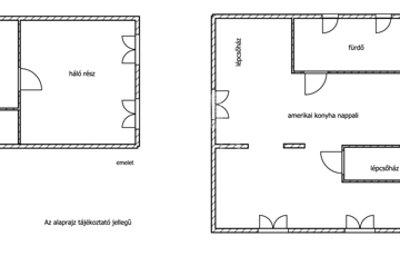 Földszinten egy előszoba, fürdőszoba, mosdóval, és amerikai konyhás nappali.