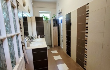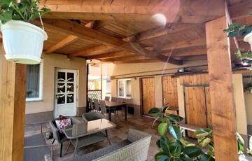Elosztása: nappali, 4 szoba, konyha, kamra, mosókonyha, zuhanyzós fürdőszoba, külön helyiségben wc, nagy fedett terasz.