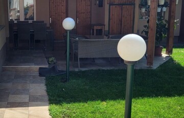 Az ingatlan udvara 457 nm., parkosított, öntözését fúrt kút biztosítja, itt helyet kapott még melléképület, 2 pince, 2 állásos garázs.