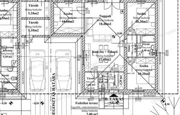 A bruttó 116, nettó 88nm-es házban előszoba, világos konyha-étkező, nappali, beépített gardróbos közlekedő, 3 különnyíló szoba, fürdőszoba, vendégmosdó és egy háztartási helyiség kerül kialakításra zuhanyzóval, ill. tartozik hozzá 5nm-es tároló, egy 2,7nm fedett és egy 15nm nyitott terasz is.