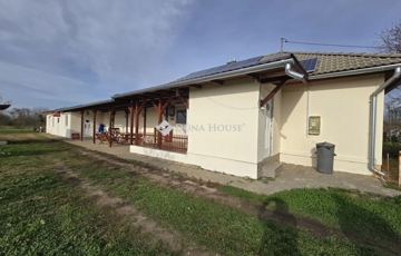 Eladó Görcsöny településen egy egy szintes, 2004-ben épült szép állapotú családi ház.Az ingatlan 4 lakószobával rendelkezik, alapterülete 100 nm, tetőszerkezete Bramac beton cseréppel fedve.A ház egy része tégla építésű, másik része könnyűszerkezetes, a falszerkezet 15 cm kőzetgyapot szigeteléssel, kívülről 10 cm külső szigeteléssel.Az ingatlan nyílászárói műanyagok, fűtése megoldott gázkazánnal, klímával (3,5 kW) , vegyes tüzelésű kazánnal, illetve elektromos kazánnal is.Az épület tetőszerkezetén elhelyezésre került 6,5 kW napelem is, mely az épület teljes villamosenergia költségeit fedezi.Elektromos autó öltésére is megfelelő.Ipari áram is elérhető az ingatlanban.Az ingatlan különlegessége, hogy a lakóépület folytatásaként, egy kislétszámú, HACCP előírásainak maximálisan megfeleltetett lakásétterem is tartozék!A falu ezen részén a csatornahálózat nem elérhető! Az épülethez tartozó területen 42 db gyümölcsfa, épített kemence és fedett terasz is található.Az épületek folytatásaként találunk egy 6x5 méteres fém szerkezetű tároló, ami raktárként, műhelyként használható.Ha további kérdése van, kérem hívjon bizalommal!
