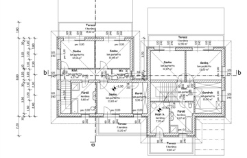Emelet: 3 szoba, közlekedő, fürdő, WC, gardrób, 2 terasz