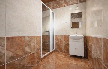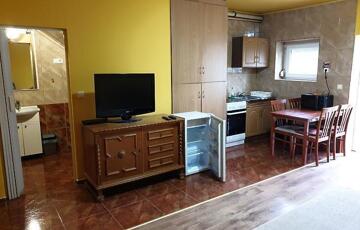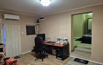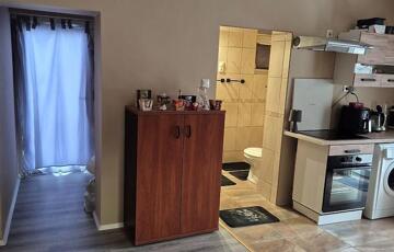 A 45 m2-részben amerikai konyhás nappali, hálószoba, fürdőszoba található, illetve terasz. Kívülről szigetelt, a villanyhálózat cserélve lett. A nyílászárók műanyagok, hőszigeteltek. A hűtés-fűtés 2 db. klímával megoldott („H” tarifa kialakítva).