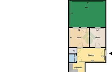 Földszint: előszoba, szoba, konyha, wc, fürdőszoba, 30nm-es kert