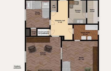 A főépület tetőtere is járható és igény esetén beépíthető, alatta 15 m2-en pince került kialakításra.