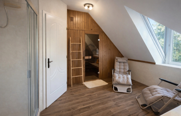Az emeleti fürdőben egy 6 személyes finn szauna került kialakításra pihenőágyakkal.