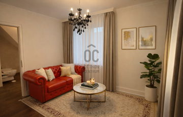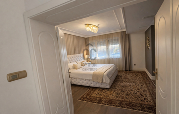 A mennyezetet klasszikus stukkó díszítés és elegáns díszlécek emelik ki, amely a modern klasszikus építészeti stílus egyik meghatározó eleme.