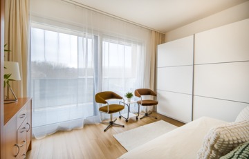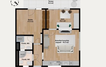 A lakás egyik legnagyobb előnye az átgondolt, ritkán elérhető elosztás: két külön nyíló hálószoba és két fürdőszoba, ami ebben a méretkategóriában kifejezetten különleges.