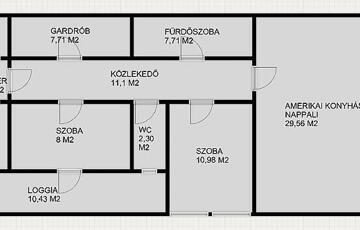 A 83 m2 emeleti lakás részei: közlekedő, amerikai konyhás nappali erkéllyel, 2 hálószoba, gardrób, fürdőszoba, wc, tároló, tágas loggia.