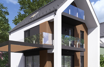 - Földszint: tágas amerikai konyhás nappali közvetlen kijárattal a 43 nm-es, pergolával fedett teraszra, előtér, vendégmosdó, valamint közvetlen átjárás a 18 nm-es garázsba;