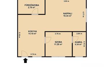 Amerikai konyhás nappali, szoba, kamra, zuhanyzós fürdőszoba + wc, előszoba.