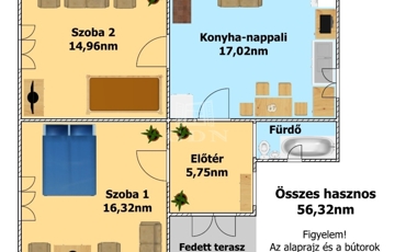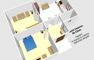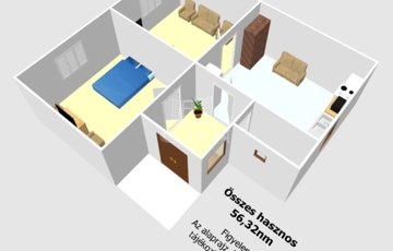 A kertes ház hasznos alapterülete 56,32nm, melyben található: