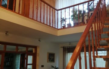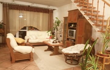 A földszint helyiségei: előszoba, konyha, nagy méretű, galériás nappali-étkező, egy másik szoba, egy fürdőszoba és külön WC.