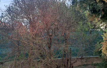 A kert füvesített, gyümölcsfák és egy sor szőlő van,