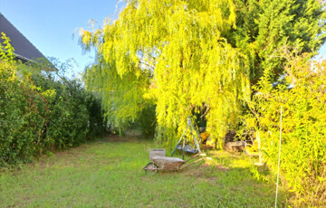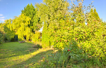 Rengeteg örökzöld, fűzfa, gyümölcsfa. A faház mögött egy művelt magaságyás lett kialakítva. Igazi "MESEKERT"!