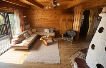Középső szint: tágas, otthonos nappali gyönyörű cserépkályhával, konyha, fürdőszoba zuhanyzóval, külön WC, közlekedő; a nappaliból terasz nyílik lenyűgöző panorámával