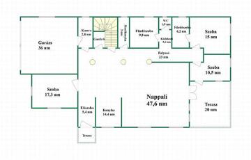 A teljes alapterület – beleértve a garázst, pincét és teraszt – 345 nm.