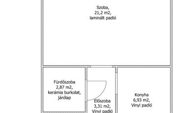 A szoba padlóburkolata laminált padló, a konyha, a mosókonyha és a bejárat vinyl burkolatot kapott, a fürdőszoba csúszásmentes, a falburkolattal azonos színű, járólapos burkolású.