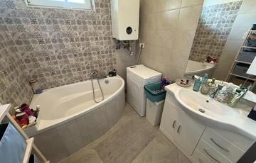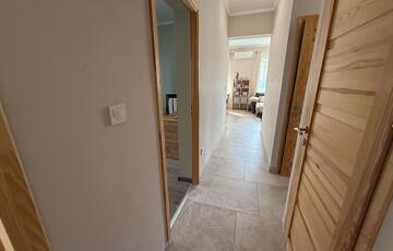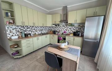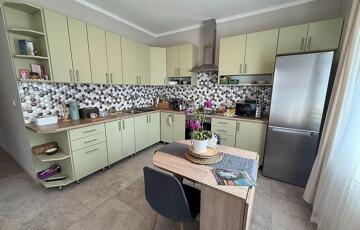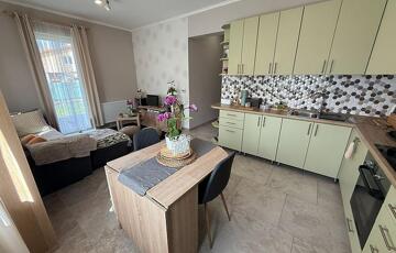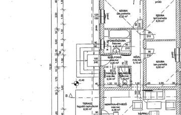 Amerikai konyhás nappali + étkező 8 négyzetméteres teraszkapcsolattal, 3 szoba, kádas fürdőszoba, wc, közlekedő, előszoba.