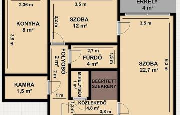 2 szoba, ablakos, étkezős konyha,zuhanyzós fürdőszoba, mellékhelyiség, közlekedő, erkély.