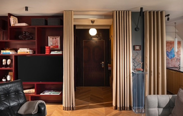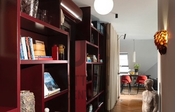 A térhez szervesen kapcsolódik a könyvtárként is funkcionáló közlekedő, ahonnan a zuhanyzós fürdőszoba, a hálószoba, valamint egy sokoldalúan használható gardrób–dolgozó–vendégszoba nyílik.