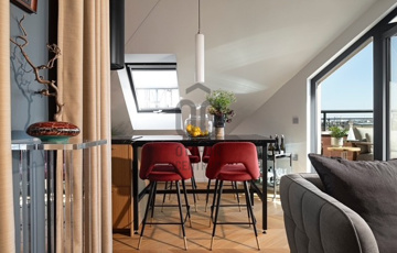 A lakás központi tere a 41 m²-es, világos nappali–étkező–konyha, amely hatalmas üvegfelületeken keresztül kapcsolódik a teraszhoz, szinte egybeolvasztva a belső és külső tereket.