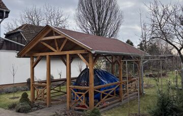 A környék hangulata kifejezetten kellemes: rendezett, tiszta utcák, barátságos környezet, ahol könnyű otthon érezni magunkat. A kert hátsó része igazi kis zöld menedék: rengeteg szőlő, alma- és barackfa terem itt, így jó időben szó szerint csak ki kell lépni a kertbe, és saját gyümölcsöséből válogathat friss finomságokat – ez az a plusz, amit egy városi lakás sosem fog megadni.