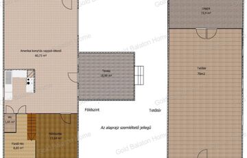 Üdülőház / főépület: földszint 85 m² + terasz, tetőtér 70 m² + loggia