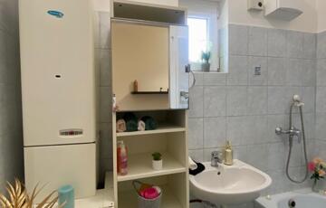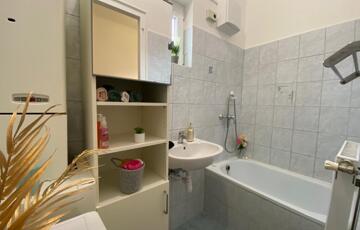 A fürdőszoba kis kádas, jól szellőztethető, ablakos, külön WC-vel.