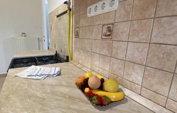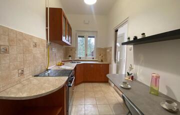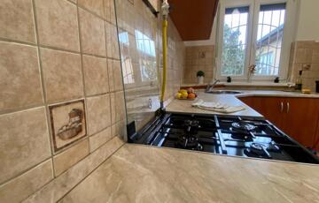 A nagy ablakos konyha, beépített bútorokkal, gáztűzhellyel felszerelt, mely a vételár részét képezik.