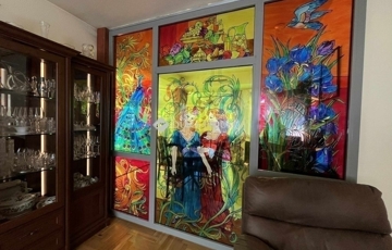 - neves üvegművész tervei alapján készült különleges üveg tolóajtó a nappali és étkező elválasztására