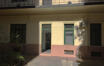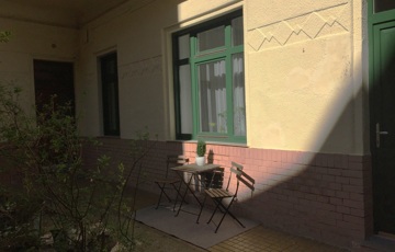 A lakás ablakai egy világos rendezett udvarra néznek.