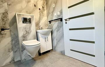 Az alsó szinten konyha, 2 szoba, egy fürdő és nappali kapott helyet, ahonnan a 30 m²-es terasz nyílik.