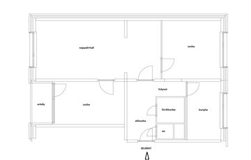 Elosztása szerint: 1 nappali-étkező/hall, 2 szoba, konyha, fürdőszoba, wc, folyosó helyiségekből áll.