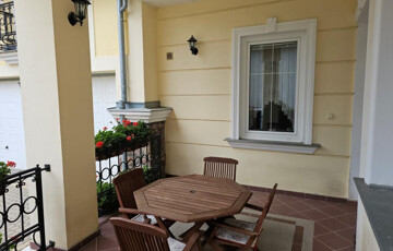 A kiadó lakás az emeleten 171 m2-es, négy lakószoba + étkező + konyha, kamra, fürdő, külön WC kialakítású, jellegében a földszinti lakással azonos azzal az eltéréssel, hogy a nyugati fekvésű, kertre néző 20 m2-es étkezőhöz terasz csatlakozik, a keleti tájolású 28 m2-es nappali szoba és a déli tájolású, kertre néző 35 m2-es nagyméretű dolgozó szoba franciaerkély kapcsolatos.