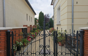 A lakásban az étkező helyezkedik el középen, ide csatlakozik a délnyugati fekvésű, kert felé néző kellemes terasz, illetve innen nyílik minden további helyiség közvetve vagy közvetlenül. Van három tágas, keleti tájolású szoba - a szélső déli ablakkal is ellátva, - fürdő zuhanyzóval és káddal, külön WC, valamint a konyha. Plusz egy háztartási helyiség, ami részben mosókonyha, részben tároló, de itt kapott helyet a kazán és a bojler is. Mindhárom szoba megközelíthető külön is, de az első és a középső át is járható. Az első, délkeleti szobának önálló bejárata nyílik a lépcsőházból is, így akár iroda funkcióra is alkalmas. A nappaliként használt középső szobában van egy üvegfalú kandalló, ami nem csupán szép és jó hangulatú, hanem hasznosan egészíti ki a cirkós fűtést. Minden külső nyílászáró SCHÜCO tip., hőszigetelt üvegezéssel, redőnnyel. A lakás alatt több részből álló pince, hátul dupla garázs és melléképület áll rendelkezésre, ezek összesen 209 m2-et tesznek ki (lakótér: 128,54 m2, terasz: 13,31 m2, pince: 28,14 m2, garázs és tárolók: 39 m2). A telek 630 m2, a garázsokig térkövezve, egyébként gyeppel borított, szépen parkosított. Mind a lakás, mind a kert kiváló állapotban vannak. A 3 fázis vételezése mind az udvaron, mind a garázsban rendelkezésre áll. Elsősorban Pécsen vagy környékén építési telket, családi házat értékegyeztetéssel beszámítunk kizárólag olyan helyen, ahol van vezetékes internet. Az emeleti lakás, amely kizárólagosan önállóan a lépcsőházból közelíthető meg, a földszinti lakás eladása mellett meghatározatlan időre bérbe vehető (a földszinti lakás vásárló prioritása mellett). A kiadó lakás az emeleten 171 m2-es, négy lakószoba + étkező + konyha, kamra, fürdő, külön WC kialakítású, jellegében a földszinti lakással azonos azzal az eltéréssel, hogy a nyugati fekvésű, kertre néző 20 m2-es étkezőhöz terasz csatlakozik, a keleti tájolású 28 m2-es nappali szoba és a déli tájolású, kertre néző 35 m2-es nagyméretű dolgozó szoba franciaerkély kapcsolatos.
