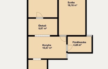 A lakás praktikus elosztású, a szobák külön nyílnak. Helyiségei: nappali, hálószoba, külön étkező, ablakos konyha, valamint ablakos, sarokkádas fürdőszoba. Az ingatlan része egy közel 10 m²-es, tágas előszoba, ahol jelenleg egy nagy gardróbszekrény kapott helyet, de akár a konyhával egybenyitható.