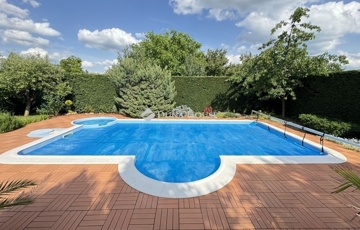 A külső tér ugyanilyen átgondolt: a parkosított kertben egy 4×8 méteres, 1,5 méter mély medence kapott helyet jakuzzival, amely tökéletes a nyári felfrissüléshez vagy egy nyugodt esti lazításhoz.