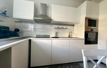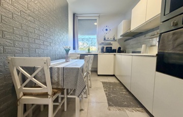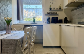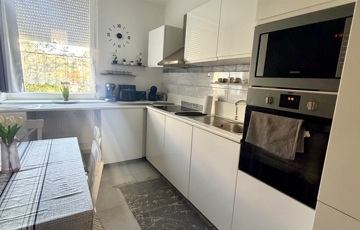 A terek tágasak, a szobák teljes értékűek. Érződik, hogy nem egy 50 m²-es lakásban vagyunk. A konyha is tágas, napos. A modern, fehér konyhabútor beépített konyhagépekkel a vételár része.