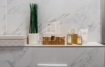 Szoba, előszoba, fürdőszoba beépített bútorokkal.